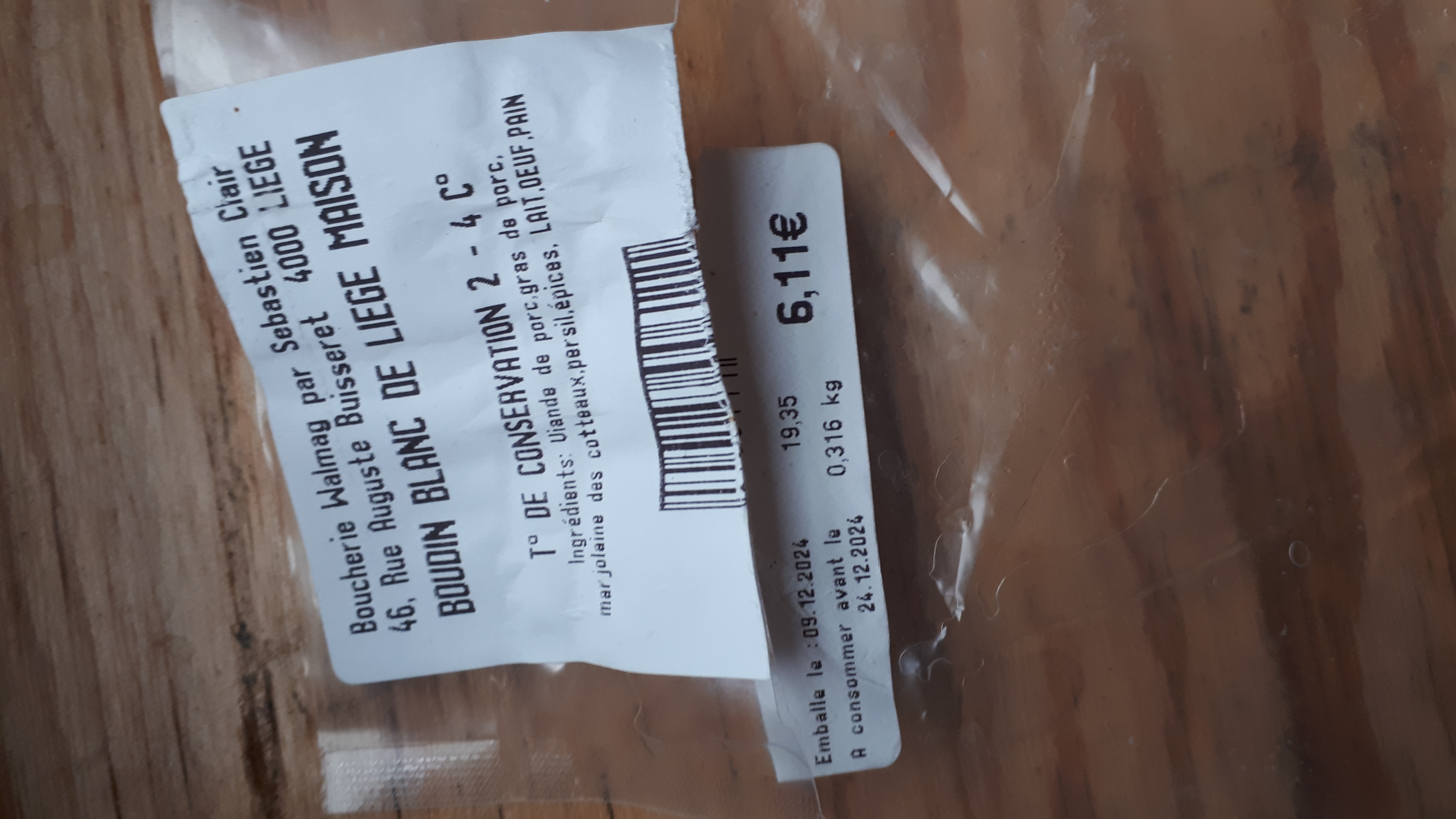 Bonjour,Merci pour le ticket.Décidément jeudi mon coop n'était pas en forme avec le clavier 😁Il a compté 1 kg de boudin et de rôti de porc.Voici les étiquettes avec le poids.Je devais payer 3,91 au lieu de 22,52 pour le rôti et 6,11 au lieu de 19,35 pour le boudinJ ai donc payé 18,61 + 13,24 en trop.Je vais donc virer 175 -31,85 = 143,15Dites moi si cela convient pour la compta ou si je dois procéder différemment.Merci pour votre attention.Bien ouftimentFrançois PetgenLe dim. 15 déc. 2024 à 06:51, Oufticoop <reply@oufticoop.be> a écrit :Merci de votre visite à Oufticoop